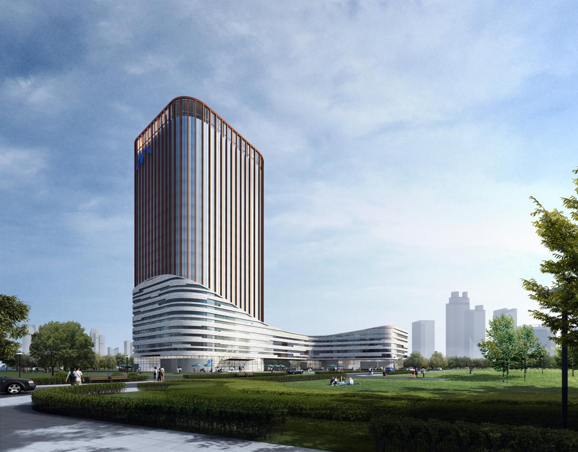 基地是了解集团文化并为科研人员提供舒适工作的地方,是一个体现企业价值并实现未来价值和梦想的场所,设计重点放在创新、明朗的立意上,功能涵盖研发、报告、展示接待、用餐、健身等一站式配套,屋顶及下沉庭院景观为研发人员提供休息交流场所,努力打造一个为员工带来幸福感的建筑。同时要体现出集团的专业特质和行业地位,具有强烈的可识别性。从集团特质出发,挖掘专业属性并与集团文化吻合。以大地的岩层为语言,从矿层挖掘宝藏,壁立千仞无欲则刚,体现集团坚毅和果敢。螺旋上升的岩层充满动感和活力,体现集团勇于开拓、不断创新高的企业精神,矿石晶体结构元素的提取,奉献出的宝藏如钻石一般动人心魄。裙房处理尽可能坚实而低调,与主楼和谐共生,寓意集团上下一心、同心同德,致力打造区域地标。